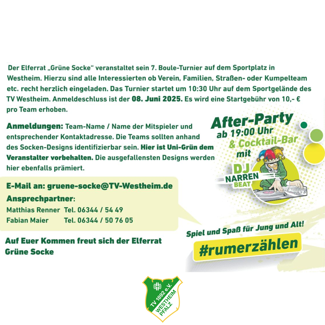 Am Samstag, 14. Juni, ab 11:00 Uhr (ab 10:30 Uhr für das Turnier) sind alle Interessierte und Sportbegeisterte eingeladen, sich auf den Sportplatz in Westheim zu treffen.