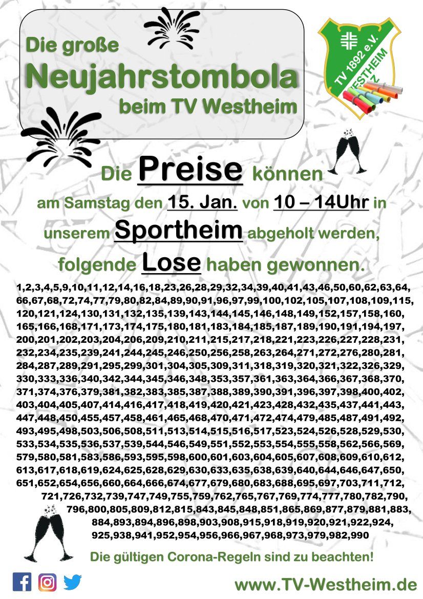 Es ist vollbracht, am vergangenen Samstag haben unseren Losfeen Johanna, Michael und Phillipp unglaubliche 363 Gewinnerlose gezogen, diese können jetzt am Samstag (15. Jan) unter Einhaltung gültiger Corona Regeln in unserem Sportheim von 10 – 14 Uhr abgeholt werden.