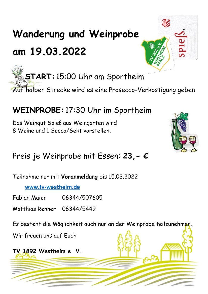 Wir möchten gern mit Euch gemeinsam am 19.03.2022 unseren Wald erwandern und das Ganze mit einer Weinprobe mit Weinen aus dem Weingut Spieß sowie einem Essen im Sportheim abschließen. Der Start ist 15 Uhr am Sportheim – damit niemand entkräftet zu Schaden kommt, gibt es auf halber Strecke eine Secco-Verkostung mit kleinen Leckereien. Im Sportheim beginnt dann die Verkostung von 8 Weinen, verbunden mit einem Essen, um 17.30 Uhr.